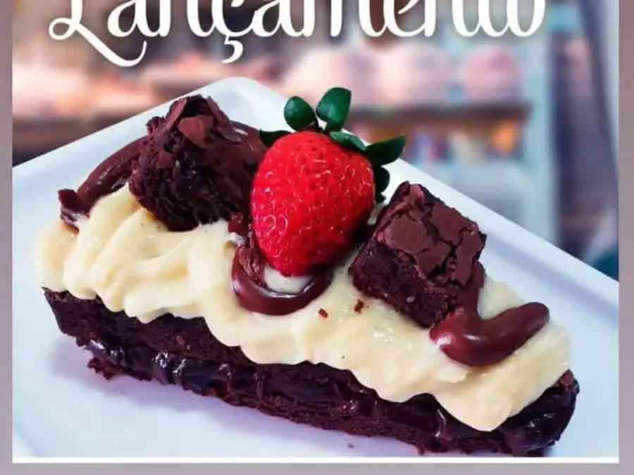 Duas camadas de brownie recheadas com brigadeiro de Ninho, brigadeiro tradicional, Nutella e morangos.