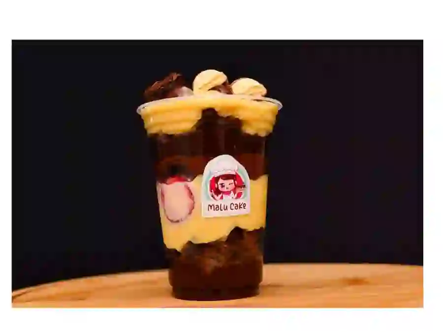 Copo de brownie recheado com brigadeiro de Ninho, brigadeiro de cacau, morangos e Nutella. Copo 400ml.