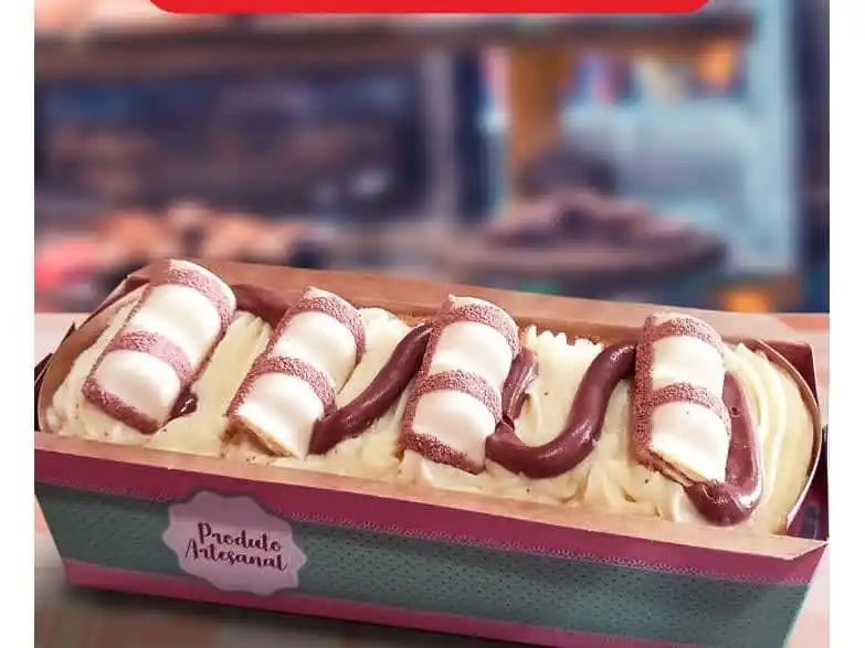 Massa de pão de ló tradicional coberta com brigadeiro de Ninho e calda de frutas vermelhas.